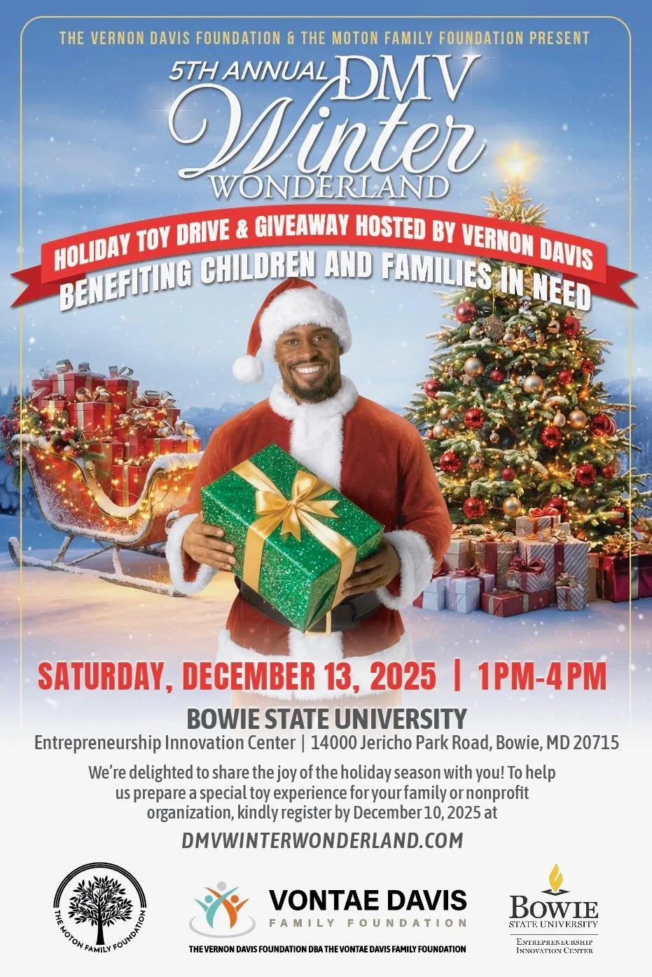 Join Super Bowl Champion, Vernon Davis, as he hosts a magical day of giving and Christmas cheer, as Santa Claus! Families will enjoy Winter Wonderland fun and festivities featuring toy giveaways for children of all ages, photos with Santa Claus and Santaās Elves, warm holiday meals, educational activities that inspire and empower, live music music and entertainment, community resources to support families, and Winter Wonderland magic around every corner!